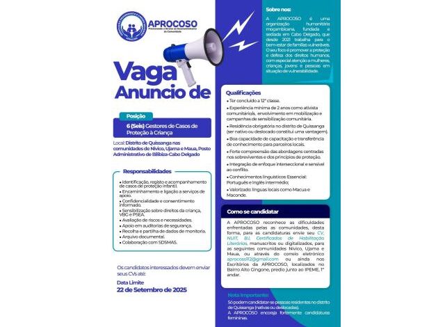 Vagas de Emprego para 6 Gestores de Casos de Proteção à Criança, a se juntar a equipe da Aprocoso