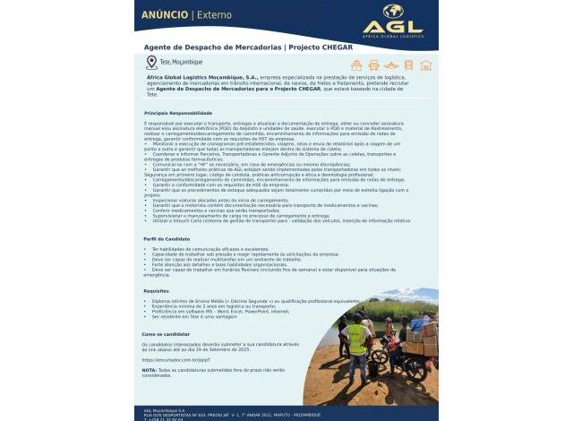 África Global Logistics Moçambique, S.A., empresa especializada na prestação de serviços de logística, agenciamento de mercadorias em trânsito internacional, de navios, de fretes e fretamento, pretende recrutar um Agente de Despacho de Mercadorias para o Projecto CHEGAR, que estará baseado na cidade de Tete.