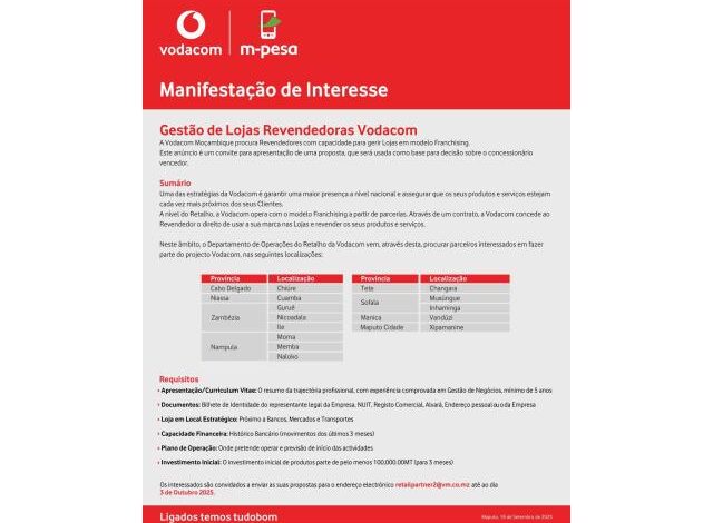 Neste âmbito, o Departamento de Operações do Retalho da Vodacom vem, através desta, procurar parceiros interessados em fazer parte do projecto Vodacom, nas seguintes localizações:
