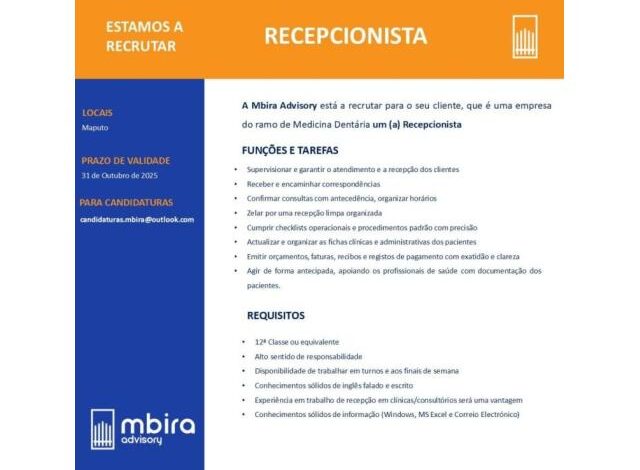 Vaga – Recepcionista, para Maputo