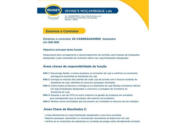 Vagas para (02) Carregadores de Sacos na Irvens Xai-Xai-Gaza