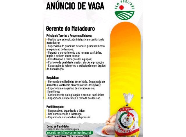 Formação em Medicina Veterinária, Engenharia de Alimentos, Zootecnia ou áreas afins (desejável);