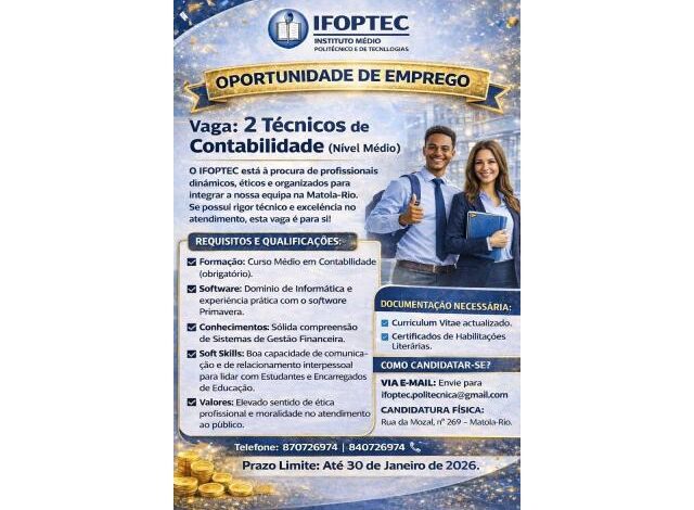 ESTAMOS CONTRATANDO O EP Management & Consultancy Services, está a contratar um COMERCIAL JÚNIOR para Maputo. Sescrição da Vaga Responsabilizar-se pela prospeção, atendimento e conversão de clientes potenciais em ven…