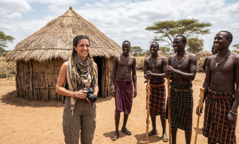 ​Após percorrer a Europa, Ásia e América do Sul, a influenciadora afirma que a sua jornada encontrou o clímax no continente africano. A imagem que acompanha a declaração tornou-se viral instantaneamente: vestida com um body rosa vibrante, ela posa diante de uma cabana tradicional, ladeada por homens locais de grande estatura.
