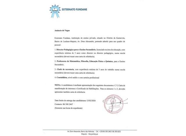 Externato Fundane, instituição de ensino privado, situado no Distrito de Kamavota, Bairro de Laulane-Maputo, Av. Dom Alexandre, pretende admitir para seu quadro de pessoal: