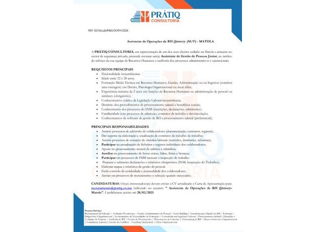 A PRÁTIQ CONSULTORIA, em representação de um cliente do setor de Segurança Privada sediado na Matola, está recrutando um(a) Assistente de Operações de RH (Júnior), responsável pelo suporte em processos de admissão, elaboração de contratos, processamento salarial, submissões ao INSS, gestão de assiduidade e compliance laboral.