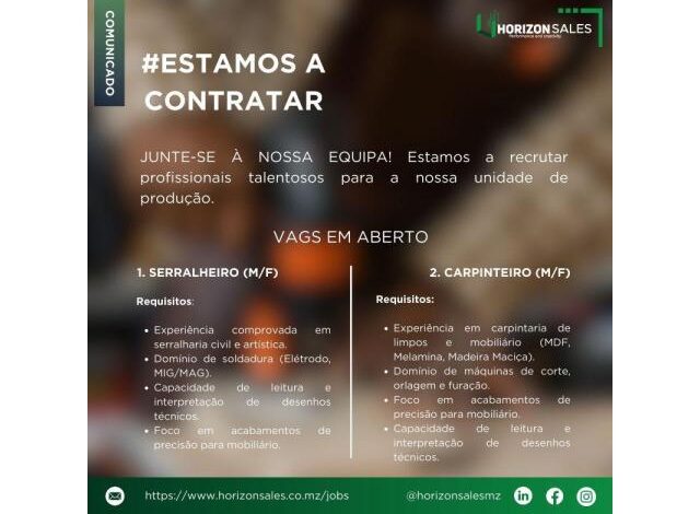 Vagas para Serralheiro e Carpinteiro
